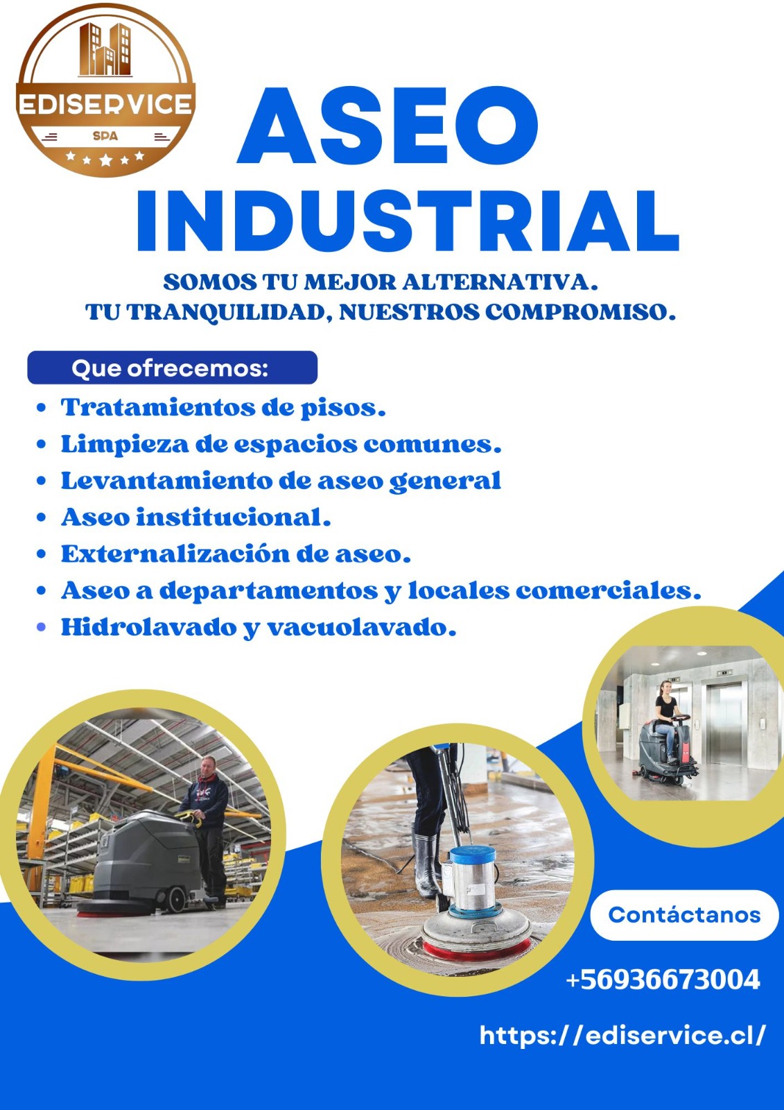 EdiService SpA ofrece aseo industrial integral y de alta calidad. Realizamos levantamientos detallados, tratamientos de pisos especializados, hidrolavado eficiente y limpieza de ductos de basura. Con maquinaria profesional y químicos de alta gama, aseguramos resultados duraderos y la máxima satisfacción del cliente.